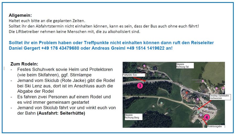 - 15:45 Rodelausgabe bei Ski-Lenz (hinter Liftstation) und Gondelfahrt zum Startpunkt des Rodelns (letzte Bergfahrt ca. 16:00 Uhr) (Punkt 4)